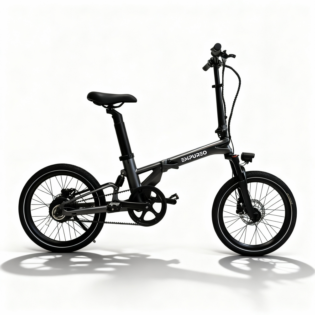 The new Empureo Folding E-Bike is engineered for riders who demand smooth performance, low maintenance, and everyday reliability. Its Gates® Carbon Belt Drive System ensures a silent, durable, and oil-free ride, while the three-speed automatic gear hub intelligently adapts to your speed and pedalling for effortless transitions. Powered by a Samsung 10.4 Ah seat-post battery delivering up to 100 km of range in Eco Mode, and supported by a re-developed throttle system that provides a strong, controlled boost from standstill, the Empureo makes every journey seamless. Comfort and safety come standard with full front and rear suspension, forged hydraulic brakes, and anti-puncture reflective tyres for superior grip and night visibility. With an integrated horn, centre kickstand, and metal rear rack and mudguards included as standard, this model is built for refined, confident commuting — available in matt black, metallic dark grey, blue, and nardo cream.